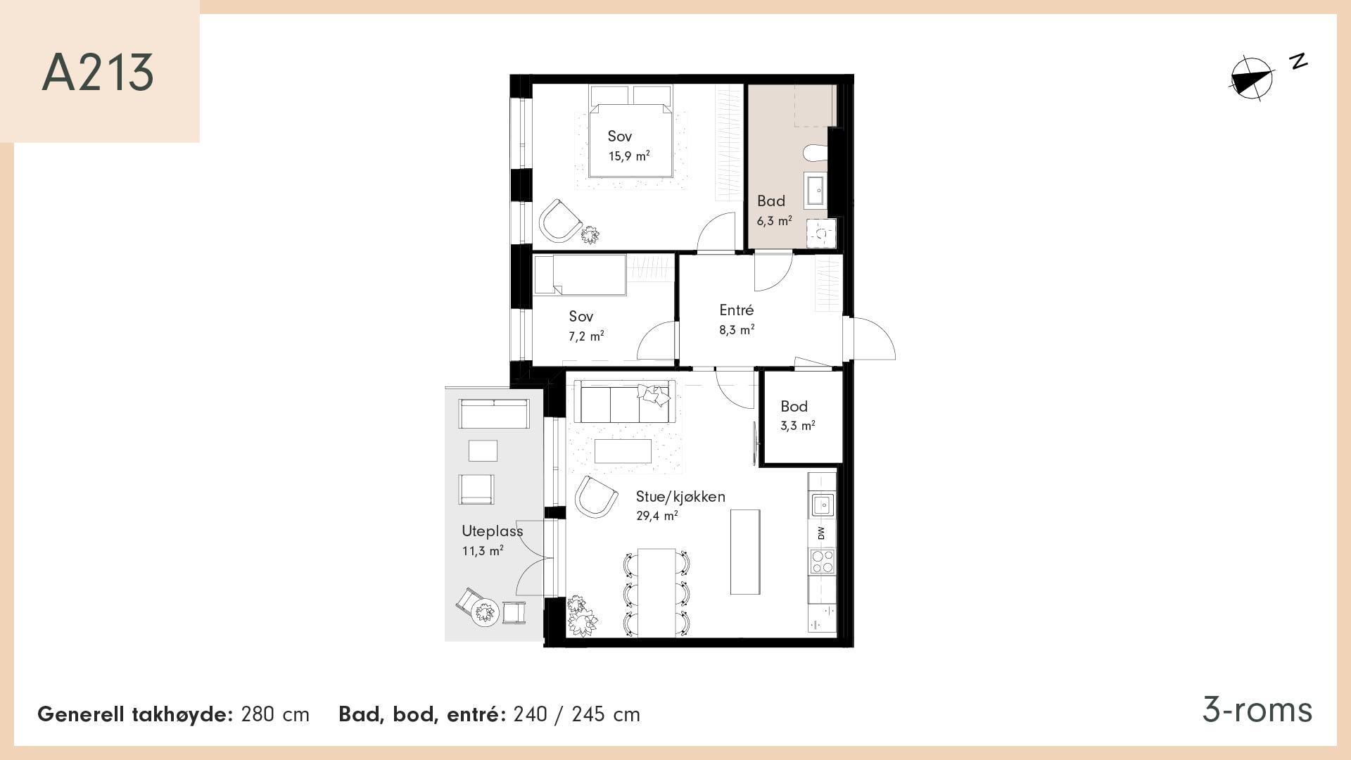 Romslig 3-roms med mye oppbevaringsplass. Stort hovedsoverom og lys og luftig kjøkken-/stueløsning med adkomst til sørvendt uteplass i gårdsrommet.
