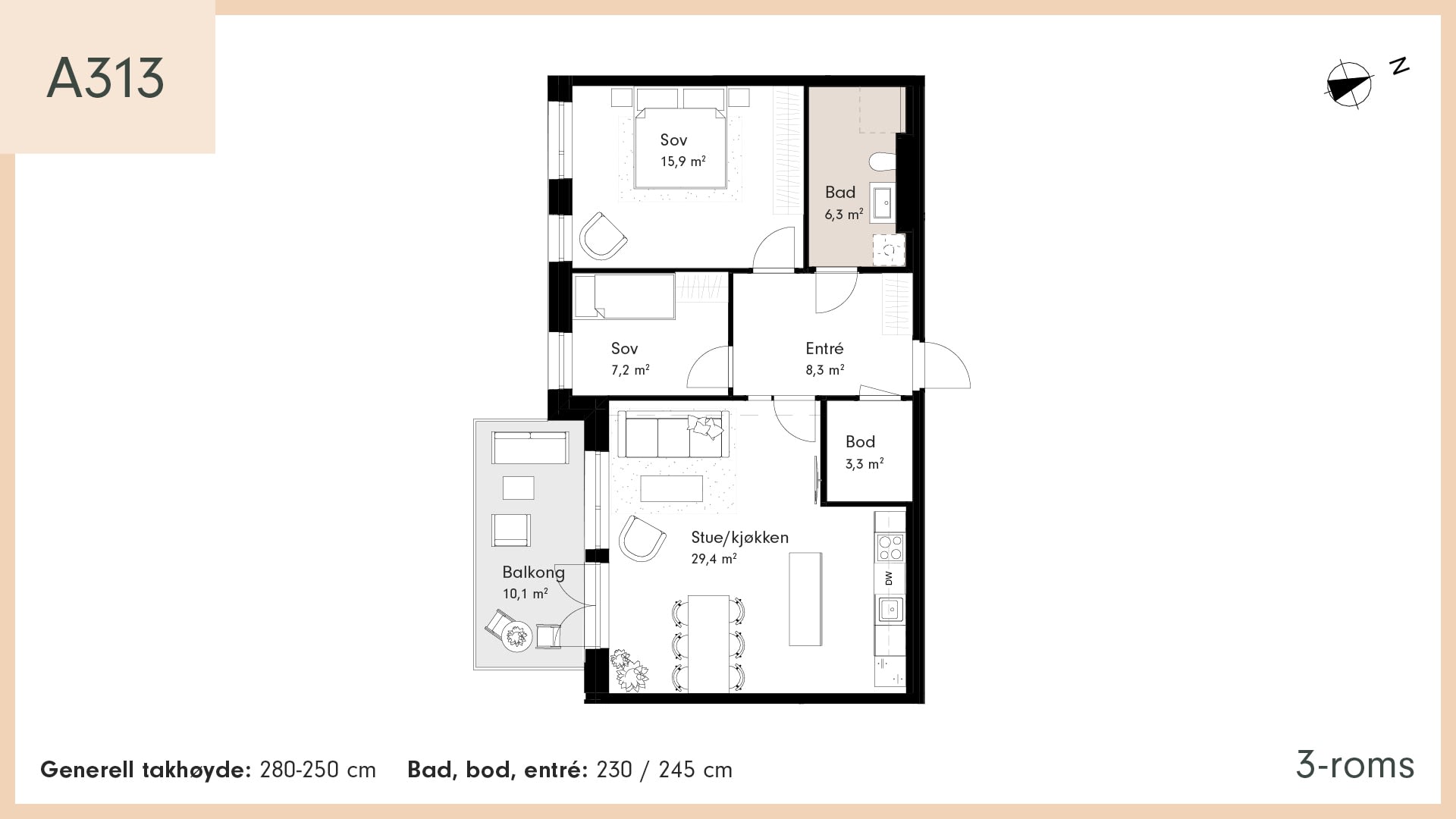 Romslig 3-roms med mye oppbevaringsplass. Stort hovedsoverom og lys og luftig kjøkken-/stueløsning med adkomst til sørvendt balkong mot gårdsrommet.